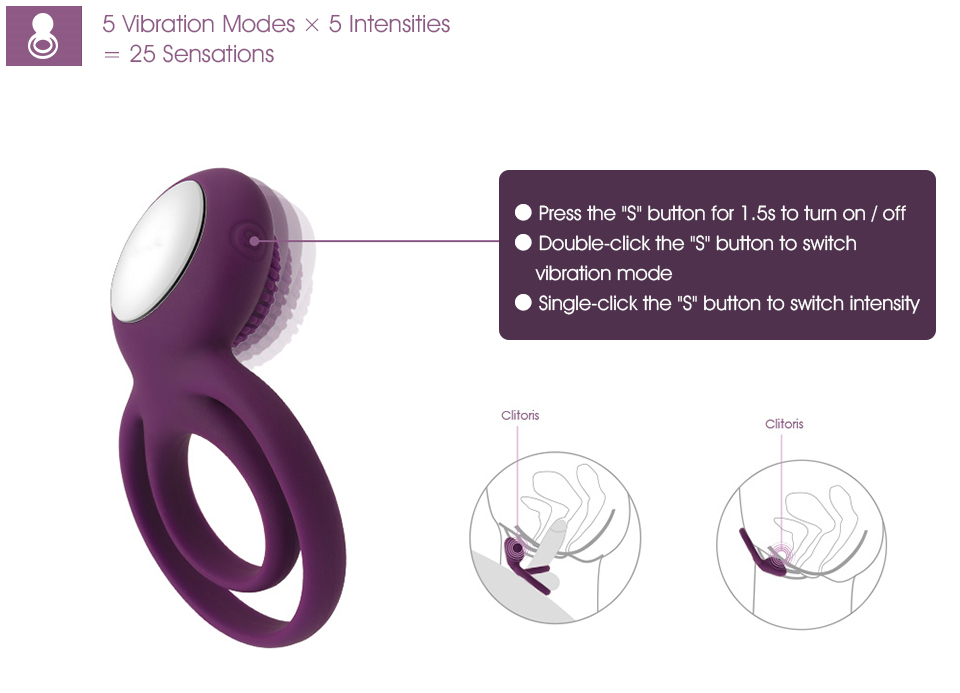The vibrator possesses the ability to prolong a man's stamina and stimulates a woman's external erogenous zone at the same time. This special double penetrator penis ring design along with the perfect angle to stimulate the clitoris makes the experience amazingly sensual.?